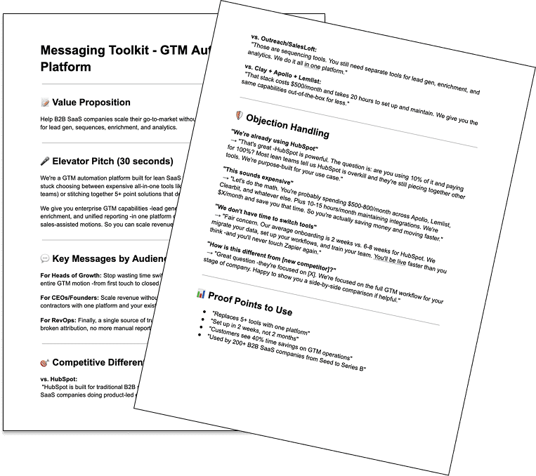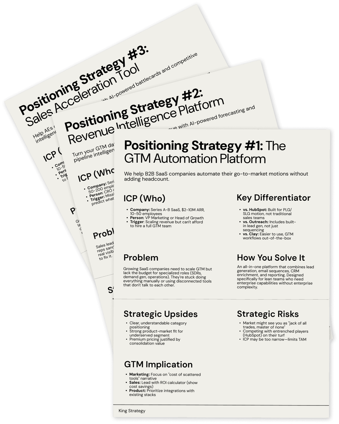 אנחנו מנתחים את השאלון שתמלאו, מקיימים סדנת Discovery מעמיקה, שומעים שיחות מכירות מוקלטות, בוחנים את המתחרים והלקוחות שלכם - ואז בונים 3-4 אסטרטגיות Positioning אפשריות. לכל אסטרטגיה מצורף ניתוח מלא של הסיכונים והשלכות ישירות על ה-GTM, המכירות והמוצר שלכם.